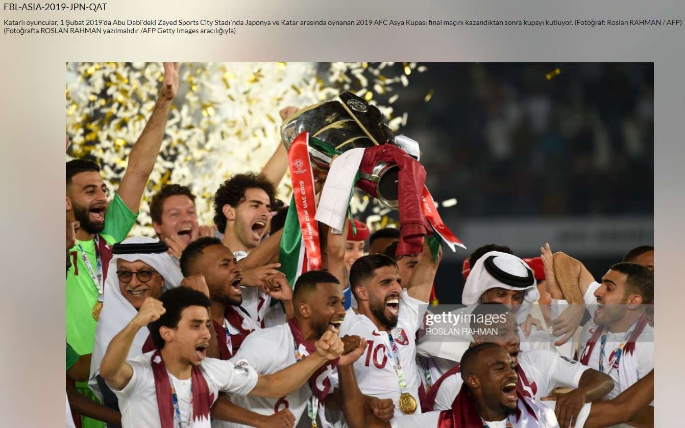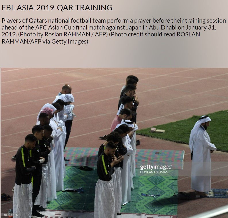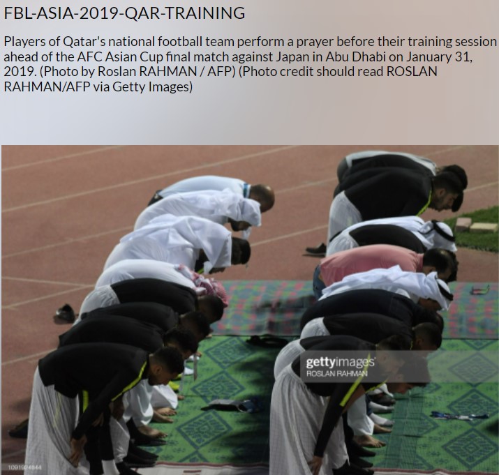 Stok fotoğraf sitesi olan Getty Images’te yer alan fotoğrafın bilgilendirmesinde ise, “Katar milli futbol takımının oyuncuları, 31 Ocak 2019’da Abu Dabi’de Japonya’ya karşı AFC Asya Kupası final maçı öncesinde antrenmanlarından önce dua ediyor” ifadelerine yer verilmiş.