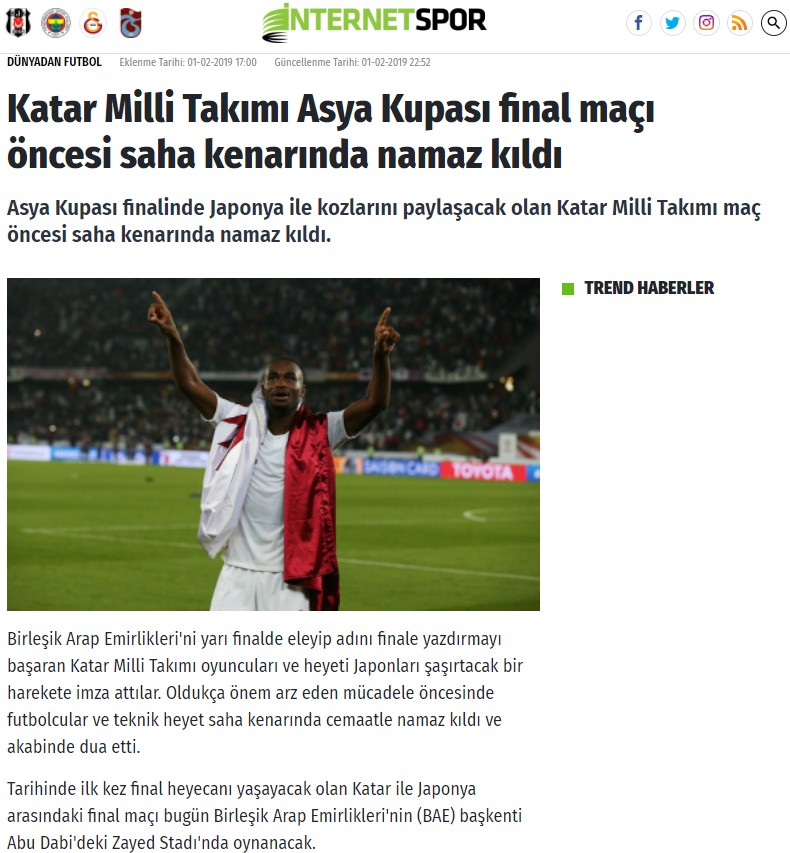 - Katar Milli takımı, Japonya ile oynayacakları final maçı öncesinde namaz kılmış.