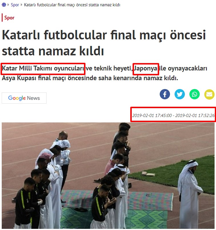 İddiada yer alan bir diğer bilgilendirmede fotoğrafın Almanya ile yapılacak olan maç öncesinde çekildiği belirtilmişti fakat fotoğraf, Katar futbol takımının Japonya’ya karşı oynayacağı Asya Kupası final maçı öncesinde kıldığı namazı gösteriyor.