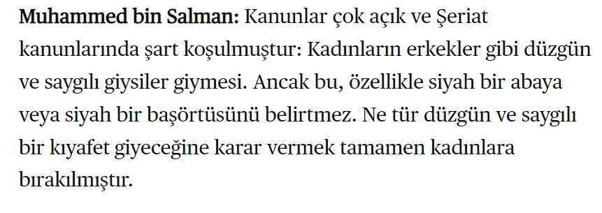 Muhammed Bin Selman, CBS News’te Norah O’Donnel’le verdiği röportajda, kadınlara yönelik olarak, “Kanunlar çok açık ve Şeriat kanunlarında şart koşulmuştur: Kadınların erkekler gibi düzgün ve saygılı giysiler giymesi. Ancak bu, özellikle siyah bir abaya veya siyah bir başörtüsünü belirtmez. Ne tür düzgün ve saygılı bir kıyafet giyeceğine karar vermek tamamen kadınlara bırakılmıştır” ifadelerini kullanmıştı.