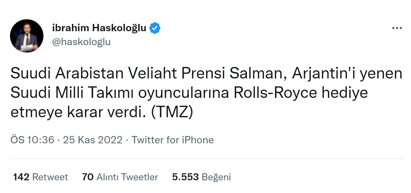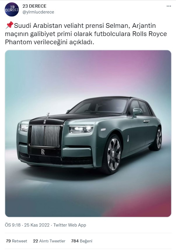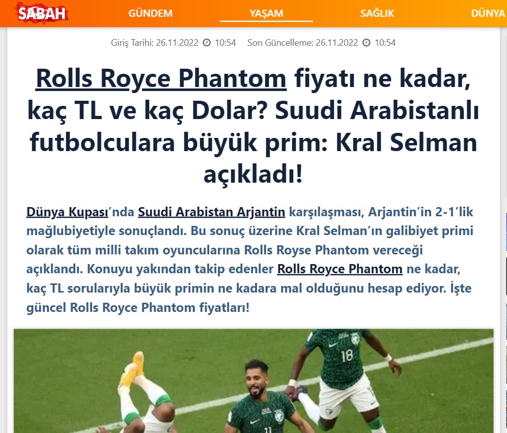 - Suudi Arabistan Milli Takımı’nın Dünya Kupası’nda Arjantin’i yendikleri için Rolls Royce Phantom araç ile ödüllendirildiği iddiası asılsız.