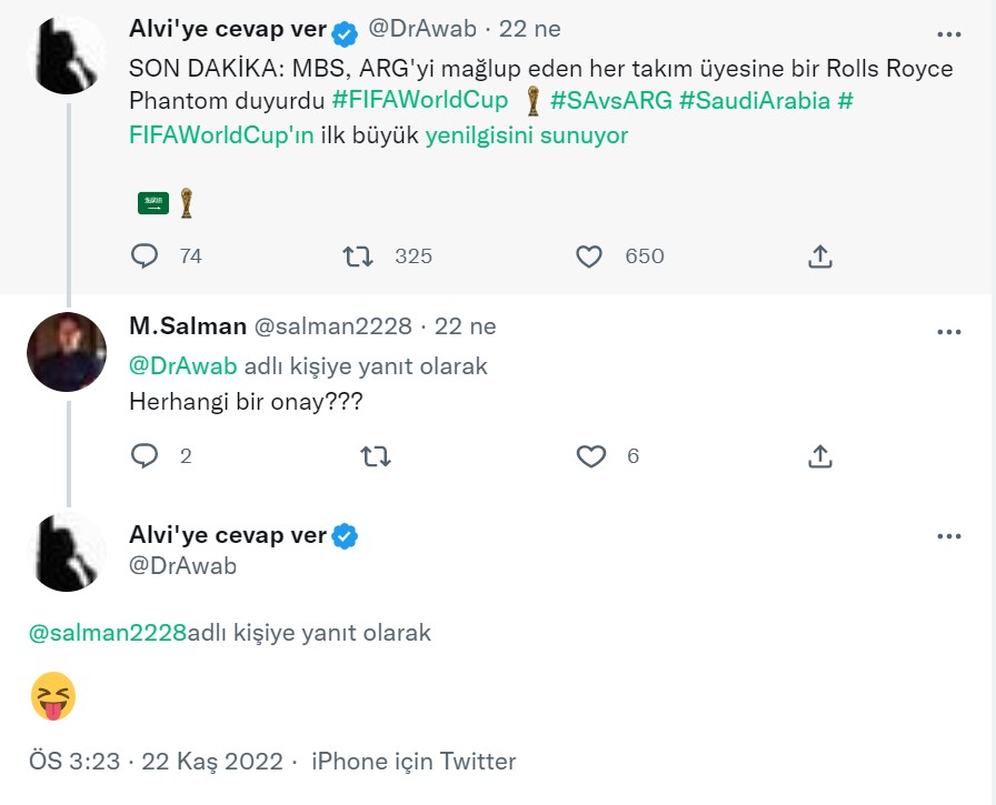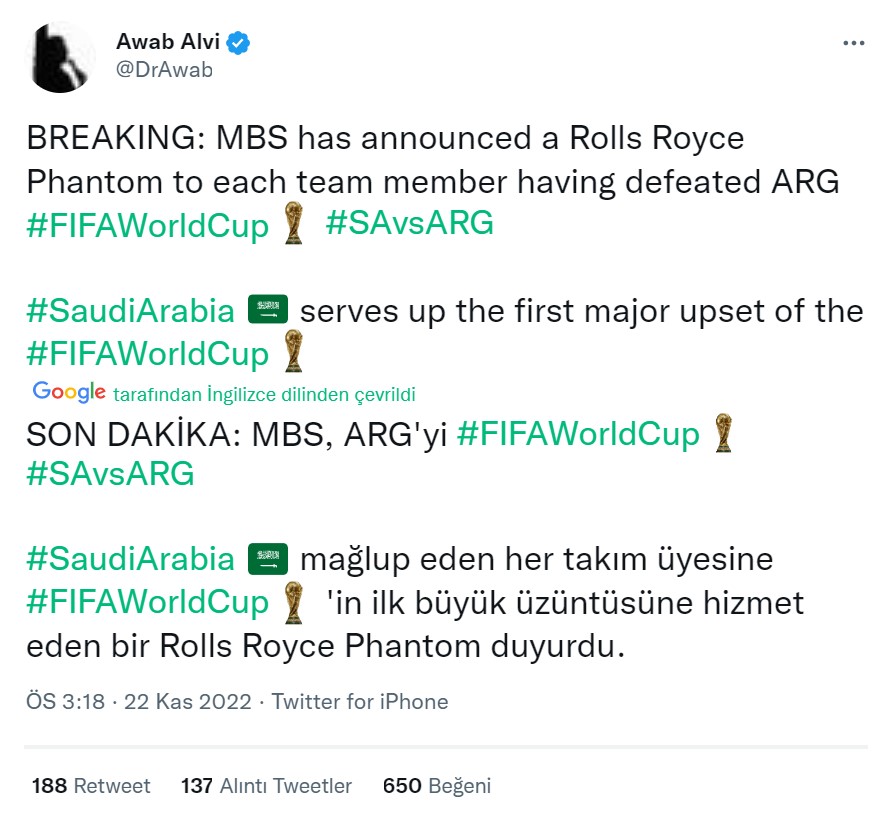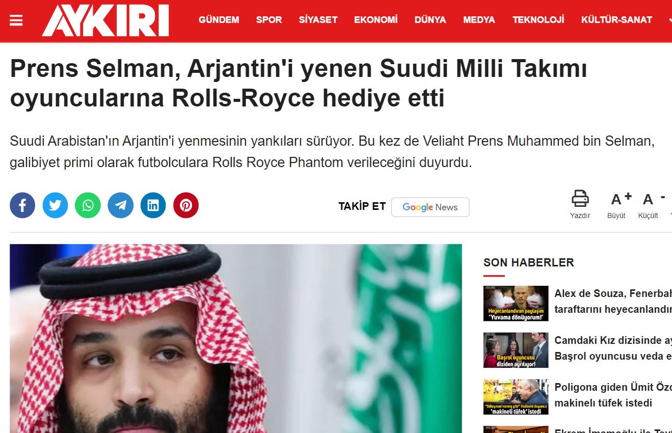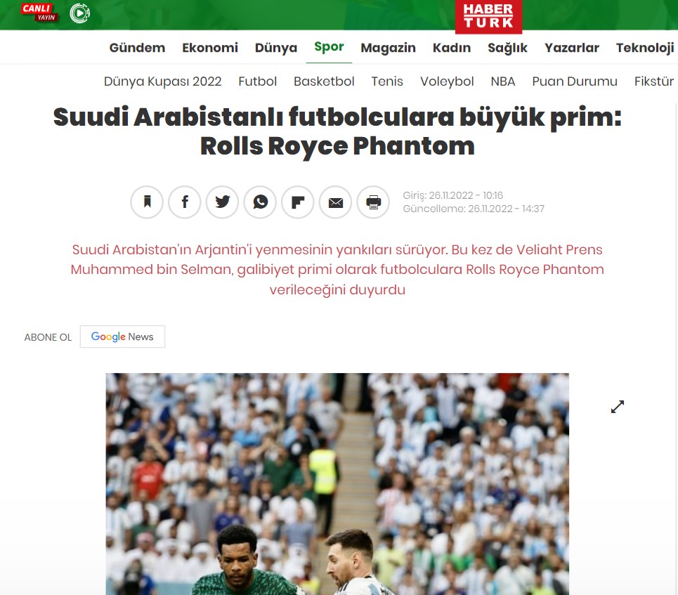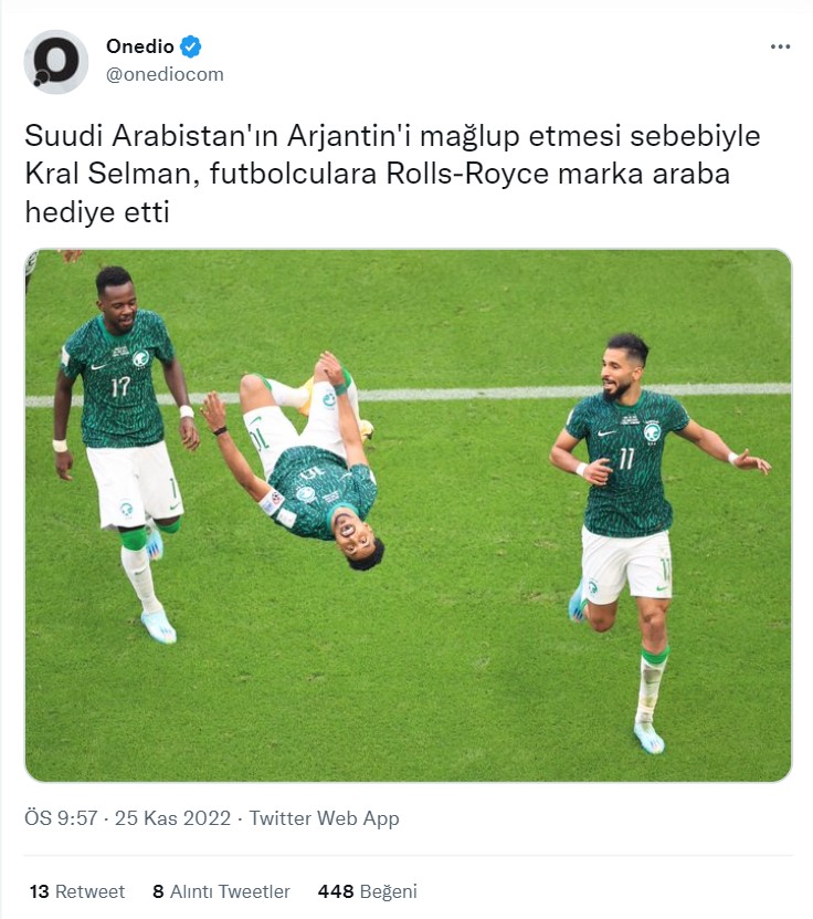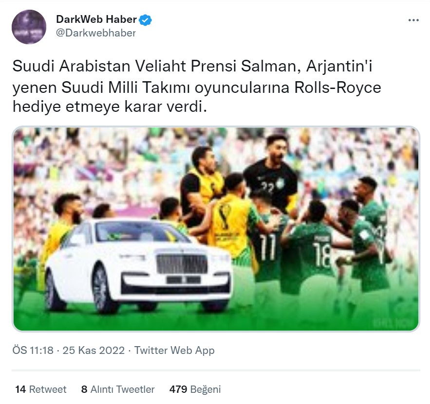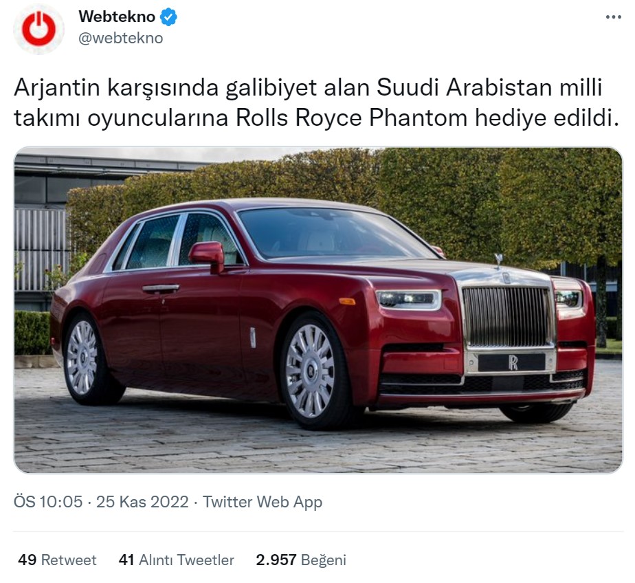 Haber sitelerinde ve sosyal medya platformlarında yayılıma giren son iddialardan birine göre Suudi Arabistan futbolcularına, Arjantin ile oynadıkları maçı kazandıkları için birer Rolls Royce Phantom model araba hediye edilmiş.