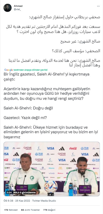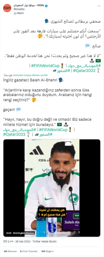 Videoda gazeteci, Arjantin’e karşı kazanılan maçın ardından her oyuncuya birer Rolls Royce araba verildiği iddiasının doğru olup olmadığını soruyor. Al-Shehri ise bunun doğru olmadığını belirterek “Ülkemize hizmet etmek ve elimizden gelenin en iyisini yapmak için buradayız” diyor.