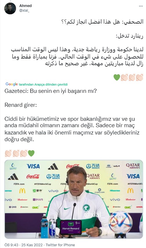 Twitter biyografisinde daha önce Sport360’da çalıştığı bilgisi yer alan ve kendisini sosyal medya yönetici olarak tanıtan kullanıcı, Suudi Arabistan’ın teknik direktörü Herve Renard’ın iddianın doğru olmadığını söylediği bir video daha paylaştı.