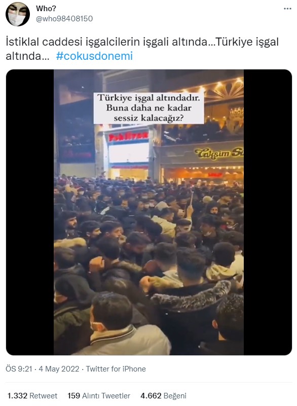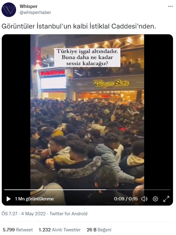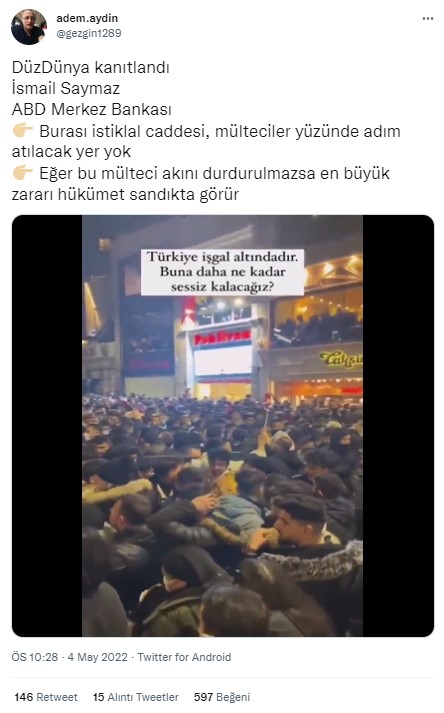 Son günlerde özellikle mülteci konularında, yanlış ilişkilendirilen görüntülerle sıkça karşılaşıyoruz. Benzer bir konuyu inceledik. İddiaya göre: “Görüntüler Taksim İstiklal Caddesi’nde kaydedilmiş ve güncel. Öte yandan görüntü, eğlenen sığınmacıları gösteriyor.”
