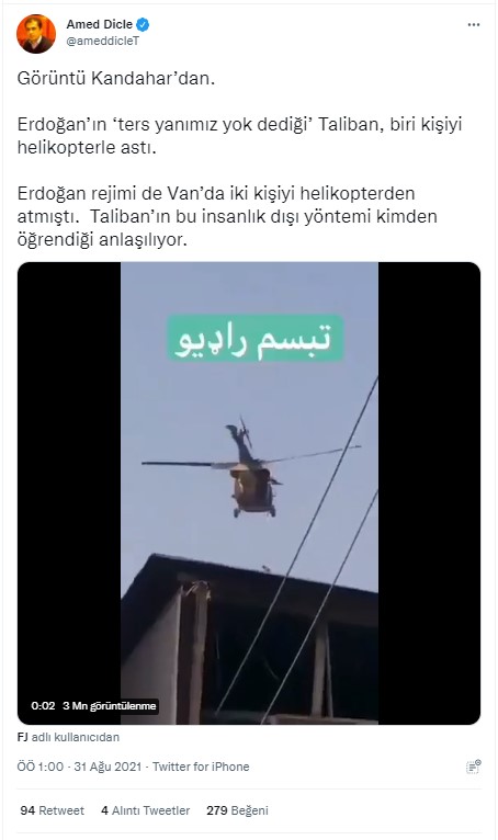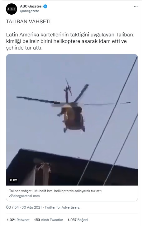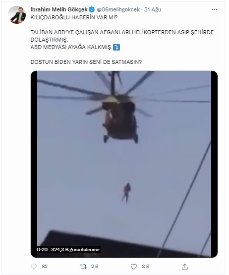 Sosyal medyada pek çok kullanıcı Afganistan’da çekildiğini iddia edilen bir videoyu paylaştı. Videoda havalanmış helikoptere bir iple bağlı bir insanın sarkıtıldığı gözükmektedir. Videoyu paylaşanlar bazı kullanıcılar ise Taliban’ın helikopterden Taliban’a karşı gelen Afganları asıp şehirde gezdirdiğini iddia etti. İddiayı ABC gazetesi, internethaber.com, Yeni Akit, Haber, Sputnik ve eski Ankara Büyükşehir Belediye başkanı Melih Gökçek de paylaştı. Video ve iddia ABD medyasında da önemli bir yer tuttu. Cumhuriyetçi Parti’den ABD başkan aday adayı Ted Cruz ve yine Cumhuriyetçi Parti’den ABD Temsilciler Meclisi üyesi Dan Crenshaw da iddiayı dile gündeme getirdi. Yapılan paylaşımlarda ABD Başkanı Joe Biden eleştirildi. İlgili video aşağıdadır.