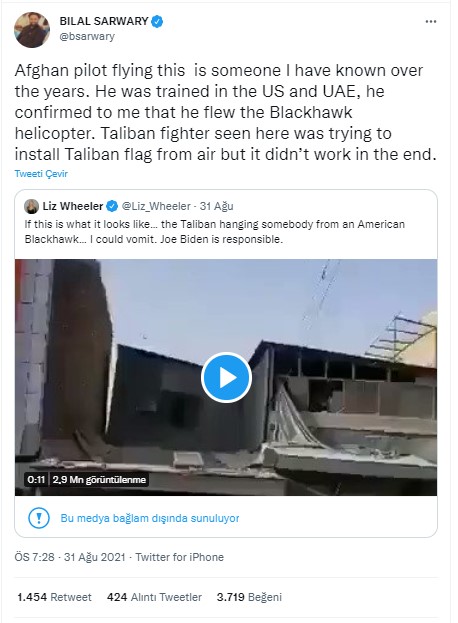 Bu video ile ilgili açıklamalara baktığımızda ise bu kişinin Taliban bayrağını asmak için helikoptere bağlandığı söylenmektedir. Başka bir videoda da bu helikopterin bayrak direğine yakın uçtuğu gözükmektedir. USA Today’in doğrulama birimi de bu iddiayı araştırdı. USA Today Tabasum Radio’ya bu olayı sordu ve asılı olan kişinin bayrak asmak için bağlandığı bilgisini aldı. USA Today aynı zamanda videoyu Tabasum Radio’nun çektiğini iddia etti. Bilal Sarwary isimli Afgan gazeteci de pilotu tanıdığını söyledi. Sarwary, helikoptere bağlı adamın bayrak asmak için helikoptere bağlandığını açıkladı.