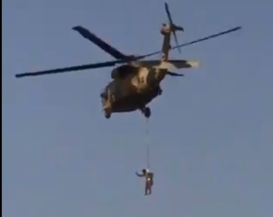 Videoyu incelediğimizde gerçekten de helikoptere asılı birini görmekteyiz. Videonun başlığından gördüğümüz kadarıyla videodaki helikopter Blackhawk UH-60’tır. Blackhawk UH-60 ile karşılaştırdığımızda da iki helikopterin oldukça benzediğini görmekteyiz.