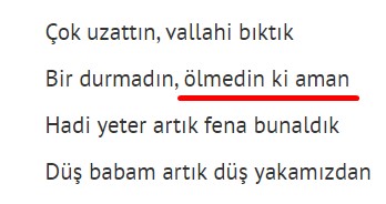 Sonuç olarak son günlerde üzerinde çokça tartışılan ve birçok bilgi kirliliğine sebebiyet veren Geççek şarkısını dinlediğimizde ve YouTube’da yayımlanan şarkının alt kısmında yer alan şarkı sözlerini incelediğimizde iddia edildiği gibi “Bir durmadın ölmedin ki aman” değil “Bi durmadın vermedin ki aman” dediği anlaşılıyor.