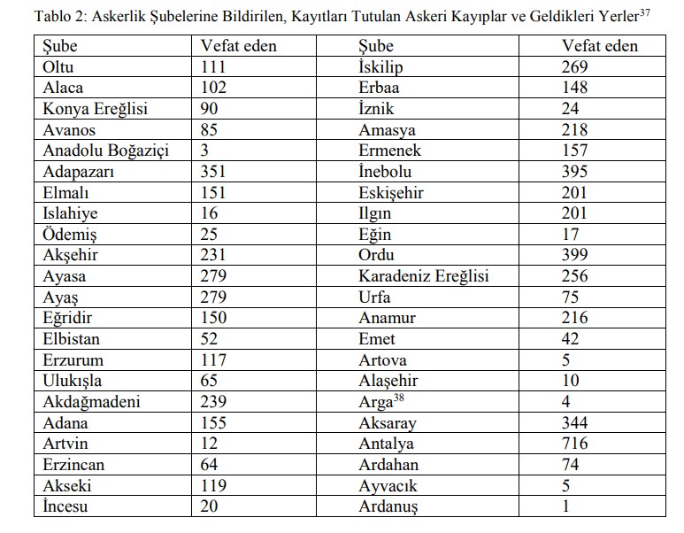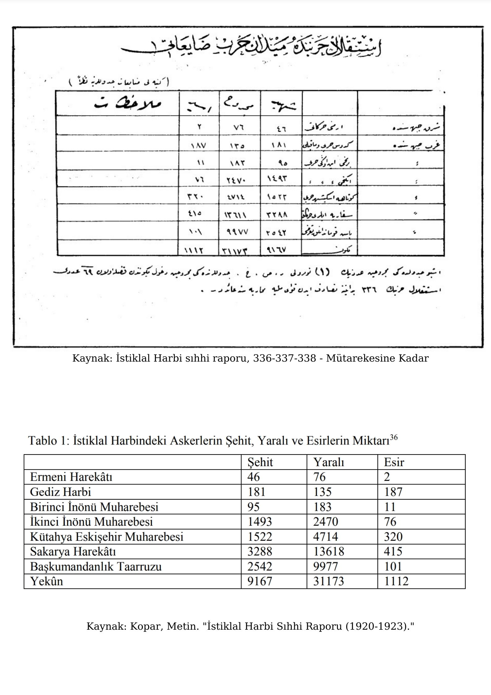 İstiklal Harbi Sıhhiye Raporu’na göre toplam 9167 şehit , 31.173 yaralımız var. Esir düşen asker sayımız ise 1188’dir. Kurtuluş Savaşı süresince şehit düşen askerlerimizin künyeleri tutulmuş ve geldikleri askeri şubeye bilgi verilmiştir. Askerlik şubeleri kayıtlarınca tutulan defterlerdeki asker kaybına bakıldığında toplamda yaklaşık 36.919 kişinin vefat ettiğini görüyoruz.