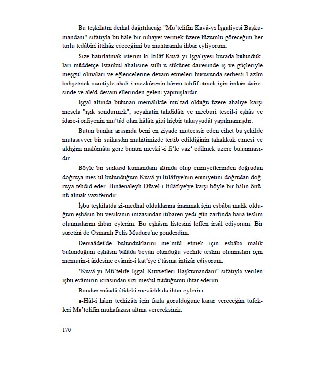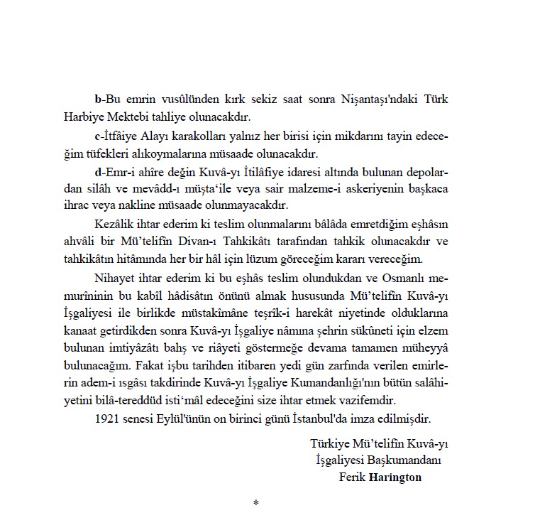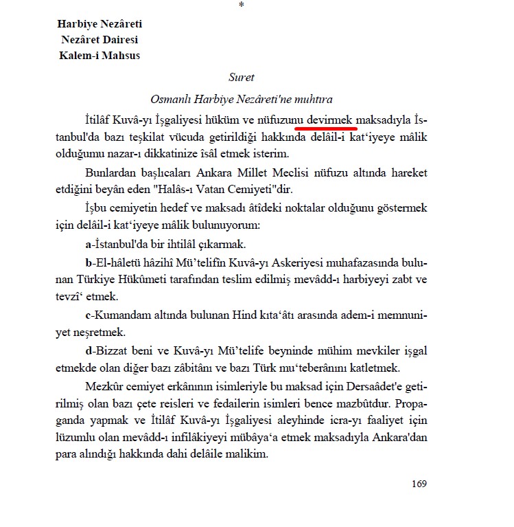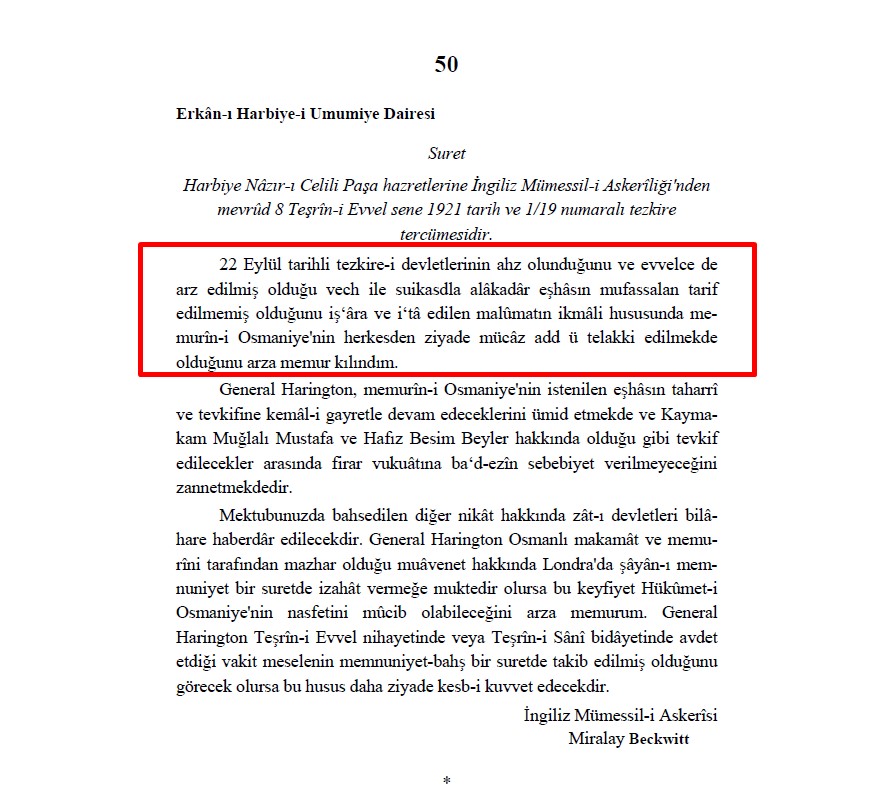 İşgal Kuvvetleri Başkomutanı General Harington‘ın farklı tarihlerde Harbiye Nezaretine gönderdiği Eylül 1337 (1921) tarihli bir ültimatomunda kendilerini devirmek amacıyla faaliyette bulunan bir teşekkül oluşturulduğundan bahsederek bunların derhal yakalanıp kendilerine teslimini istiyordu.
