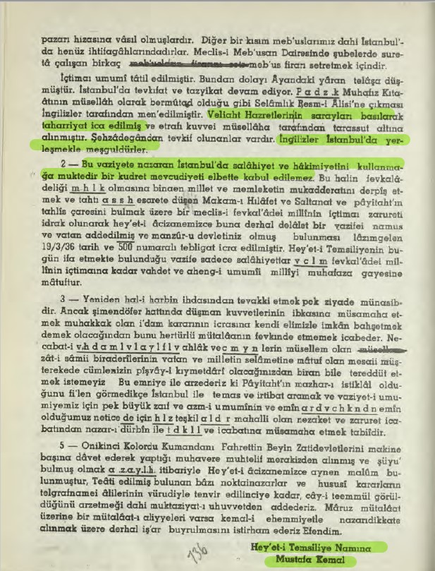 İşgal sonrasında komutanlar Rumeli ve Anadolu’da teşkilatlanmaya başladı. Sivil halk ise protestolar düzenledi. Mustafa Kemal Paşa, Hey’et-i Temsiliye adına gönderdiği telgrafta, 14. Kolordu Komutanı Yusuf İzzet Paşa’ya İstanbul’da şehzadenin dahi sarayının basıldığını, İngilizlerin İstanbul’a yerleşmekle meşgul olduklarını belirtmiş. Bu, işgalin ne kadar ciddi olduğunu gösteren belgelerden biri olarak kabul edilebilir.