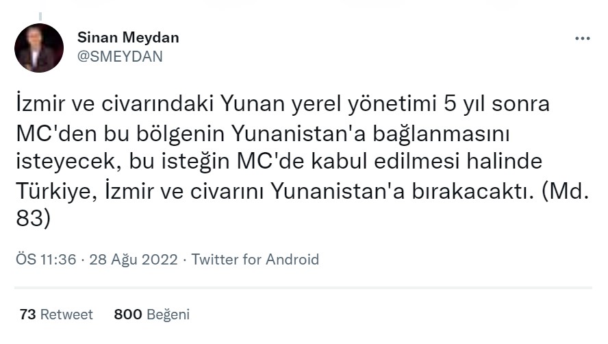 Tarihçi yazar Sinan Meydan, Twitter hesabından yaptığı paylaşımlar ile İsmail Kahraman’ın söylediğinin gerçekle bağdaşmadığını belirtti. Meydan, İzmir’in 15 Mayıs 1919’da işgal edildiğini; 10 Ağustos 1920’de imzalanan Serv Antlaşması ile Yunanların şehrin yönetimini devraldığının altını çiziyor.