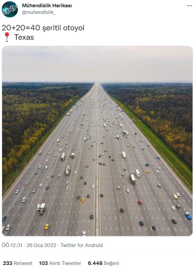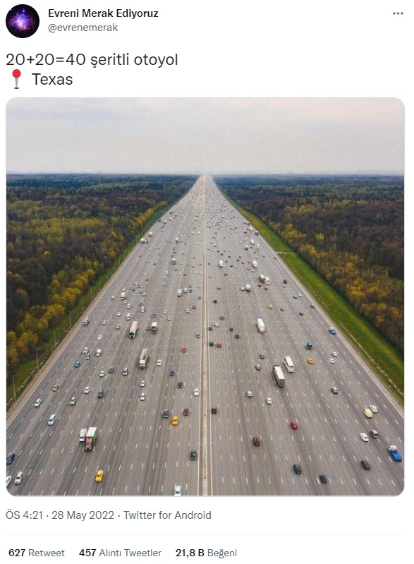 Twitter’da karşımıza çıkan bir görselde, bu trafik sıkıntısını tamamıyla çözülmüş gibi görünüyor. “20+20=40 şeritli otoyol, Texas” açıklamasıyla paylaşılan bir fotoğrafa gelen yorumlar da, paylaşımın kendisi gibi bir hayli ilgi çekici.