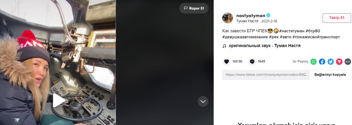 Konu hakkında Google üzerinde anahtar kelimelerle yaptığımız arama sonucunda videoda yer alan kişinin TikTok fenomeni Nastya Tuman olduğu bilgisine ulaştık. Tuman’ın paylaşımı Rusya – Ukrayna geriliminden aylar öncesine dayanıyor. Tuman’ın şubat 2021’de yaptığı paylaşıma “zırhlı personel taşıyıcı CHPEK nasıl başlatılır” notu düştüğü görülüyor.