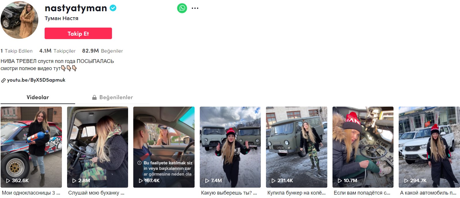 Videodan elde ettiğimiz ekran görüntüleri ise bizi Tuman’ın diğer sosyal medya hesaplarına ulaştırdı. Tuman’ın hesaplarını incelediğimizde YouTube kanalında bulunan hakkında kısmında Rusya’da yaşadığı, video içerik üreticisi ve otomotiv tamircisi olduğu bilgisine eriştik. Profilinde genellikle arabalarla alakalı paylaşımlarda bulunan TikTok fenomeni Tuman, arabaların onarım, bakım ve tamir gibi konularda video paylaşan bir içerik üreticisi.