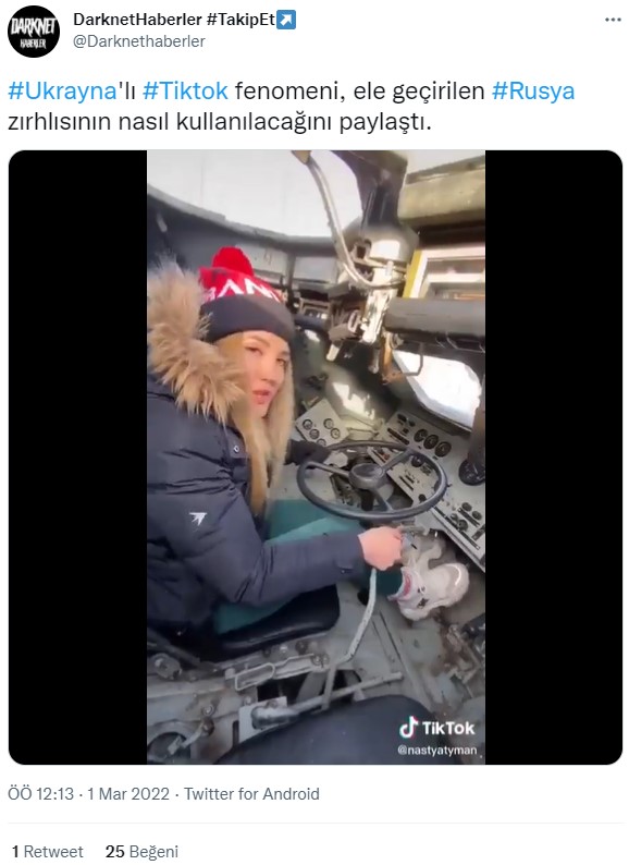 Sosyal medyada, son zamanlarda yaşanan olaylarla bağlantılı olduğu düşünülen bir görüntü yayılıyor. İddia söylemlerine göre videoda Ukraynalı bir kadın yaşanan çatışmalar sonucu Ruslar tarafından terk edilen askeri tankına sahip çıkarak nasıl kullanılması gerektiğini aktarıyor.