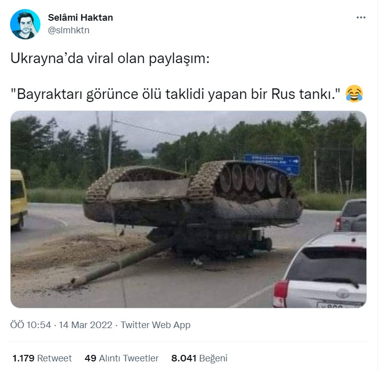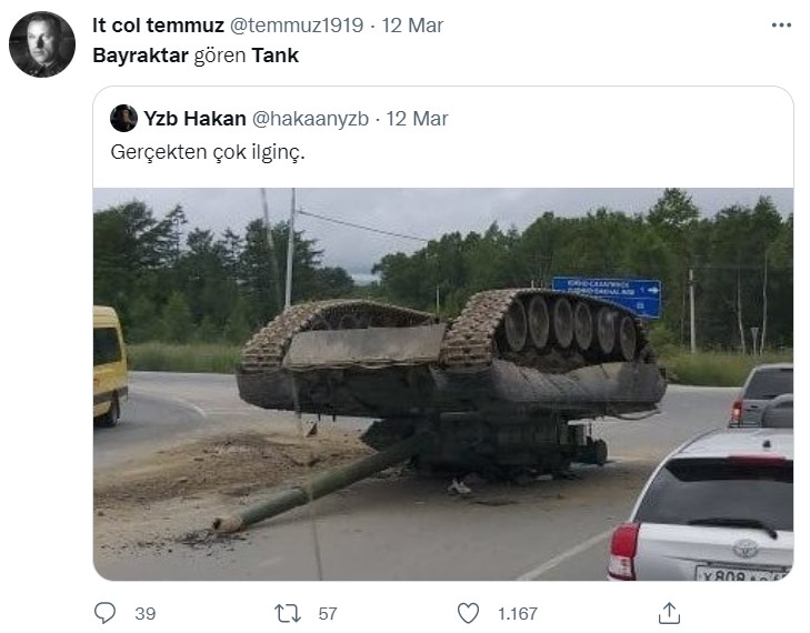 Twitter kullanıcıları ve bazı medya kuruluşları tarafından “Bayraktar gören tank” açıklamasıyla paylaşılan bu ters dönmüş tank fotoğrafı oldukça gündemde.