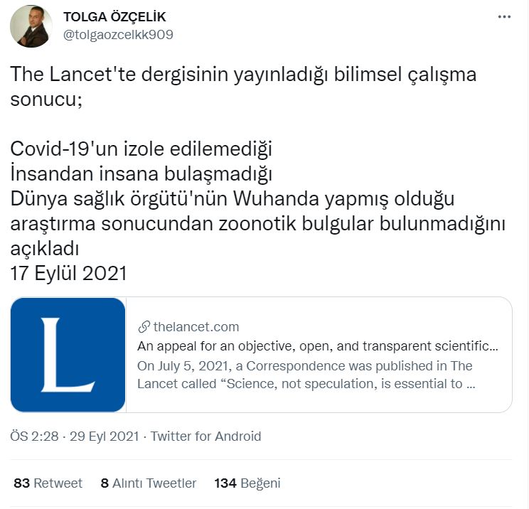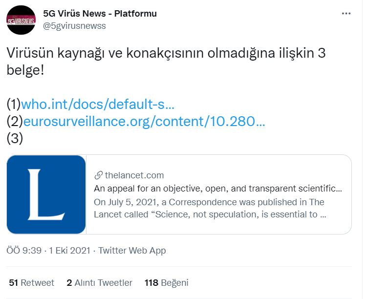Sosyal medyada aşı karşıtları paylaştıkları yeni iddiada Covid-19 virüsünün kaynağı ve konakçısının olmadığının kanıtlandığını belirtti. Buradan hareketle de virüsün gerçek olmadığı iddia ettiler. İddiaya kanıt olarak ise 3 belge gösterdiler. Bu belgelerden biri The Lancet’te yayınlanan bir yazıdır. Diğer ikisi ise Dünya Sağlık Örgütü’nün ve Eurosurveillance dergisinin yayınladığı yazılardır. Aşı karşıtları özellikle the Lancet dergisindeki yazıyı öne çıkarmaktadırlar.