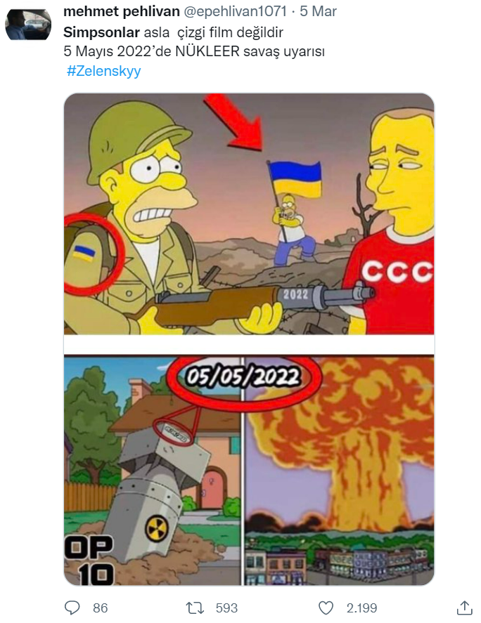 Neredeyse her önemli olayın ya da güncel meselenin ardından mutlaka bir “Simpsonlar yine bildi!” paylaşımına denk gelmişizdir. Son yaşanan Rusya – Ukrayna krizi ve gündeme gelen nükleer savaş söylentileriyle ilgili bir gönderi paylaşıldı.