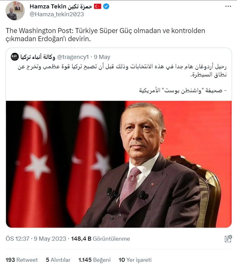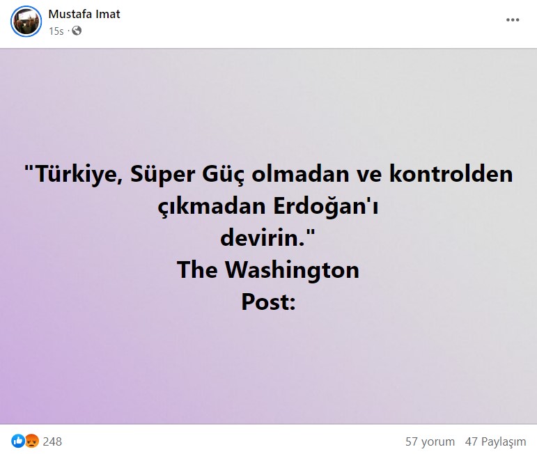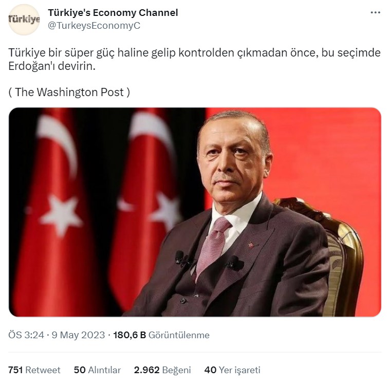 Sosyal medyada yayılıma giren bir iddiaya göre Amerika merkezli gazete Washington Post bir yazısında “Türkiye bir süper güç haline gelip kontrolden çıkmadan önce, bu seçimde Erdoğan’ı devirin.” ifadesini kullanmış.