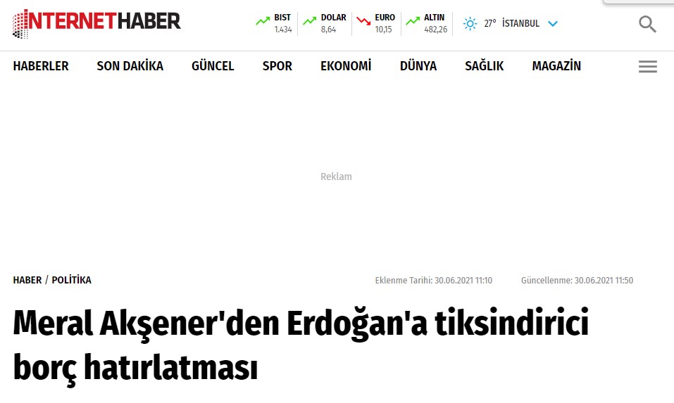 Erdoğan’ın bu açıklaması üzerine 30 Haziran 2021 tarihindeki grup toplantısında ise İyi Parti Genel Başkanı Meral Akşener Kanal İstanbul’u sebebiyle alınacak borçların geri ödememek konusunda bir açıklama yapmıştır. Meral Akşener açıklamasında iktidar değiştiğin Kanal İstanbul kaynaklı borçları ödemeyeceklerini bildirdi. Bunun için uluslararası hukukta yer alan tiksindirici borç hakkını kullanacaklarını belirtmiştir. Bununla alakalı Meral Akşener: “Uluslararası hukukta, tiksindirici borç diye bir kavram var. Bu kavram dış borç alan ve bunu milletinin menfaatine harcamak yerine kendi kişisel ikbali için harcayan liderler için kullanılır. Bu liderler iktidardan düştükten sonra o borcun ülkedeki vatandaşlardan değil borcu alan liderin kişisel harcaması olarak kabul edilerek o kişinin bizzat kendisinden tahsil edilmesini söyler” dedi ve tiksindirici borç koşullarını açıkladı.