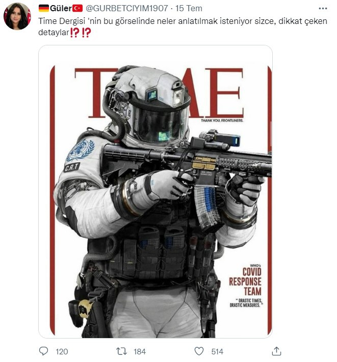 Son günlerde, sosyal medyada bu iddialara bir yenisi daha eklendi. Elinde bir aşı silahı olan kişi ve bir dizi uluslararası semboller içeren bu kapak tasarımı, Time ile ilişkilendirilmiş.