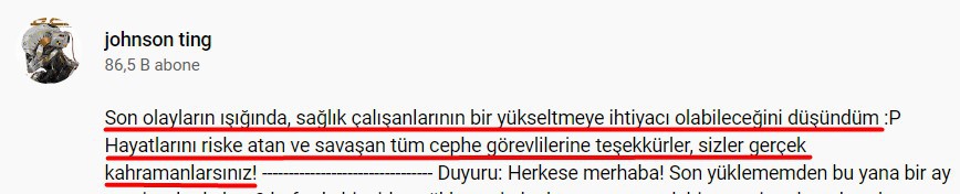 “Son olayların ışığında, sağlık çalışanlarının bir yükseltmeye ihtiyacı olabileceğini düşündüm. Hayatlarını riske atan ve savaşan tüm cephe görevlilerine teşekkürler, sizler gerçek kahramanlarsınız! ”