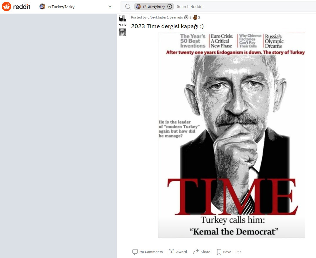 Geçtiğimiz günlerde Kemal Kılıçdaroğlu’nun resmi sosyal medya hesabından bazı açıklamalar yapması kamuoyunda gündem oluşturmuştu. Paylaşılan gönderiler arasında bir görsel kısa sürede kullanıcılar arasında yayılıma girdi. Söz konusu görselde Kılıçdaroğlu’nun Time dergisinin kapağında yer aldığı görülüyor.