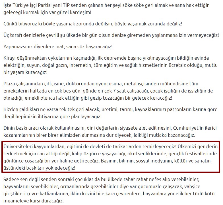 Üniversiteleri kayyumlardan, eğitimi de devleti de tarikatlarden temizleyeceğiz! Ülkemizi gençlerin terk etmek için can attığı değil, kalıp özgürce yaşayacağı, okul şenliklerinde, gençlik festivallerinde gönlünce coşacağı bir yer haline getireceğiz. Basının, bilimin, sosyal medyanın, kültür ve sanatın üstündeki baskıları yok edeceğiz!