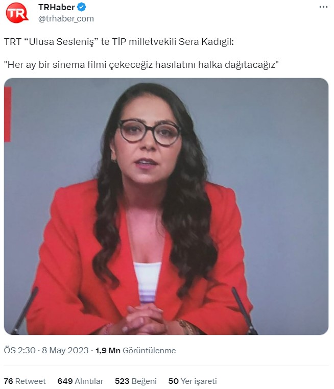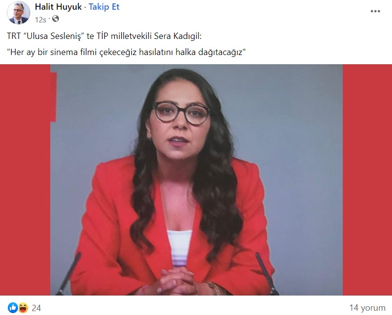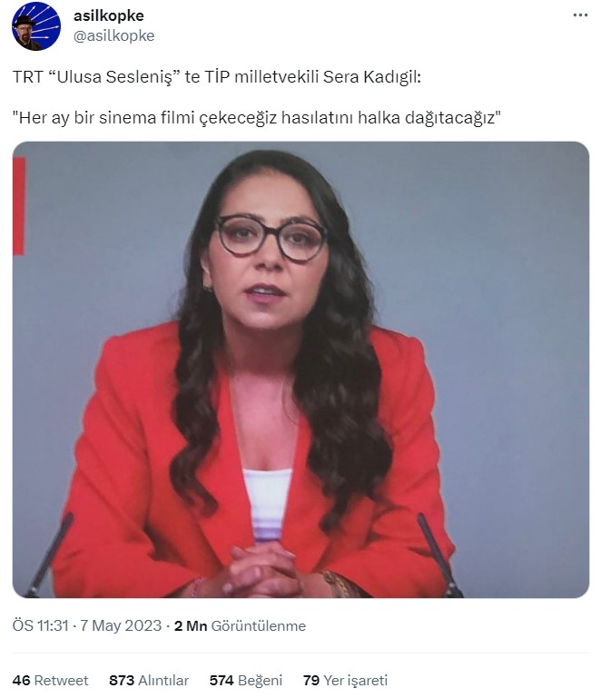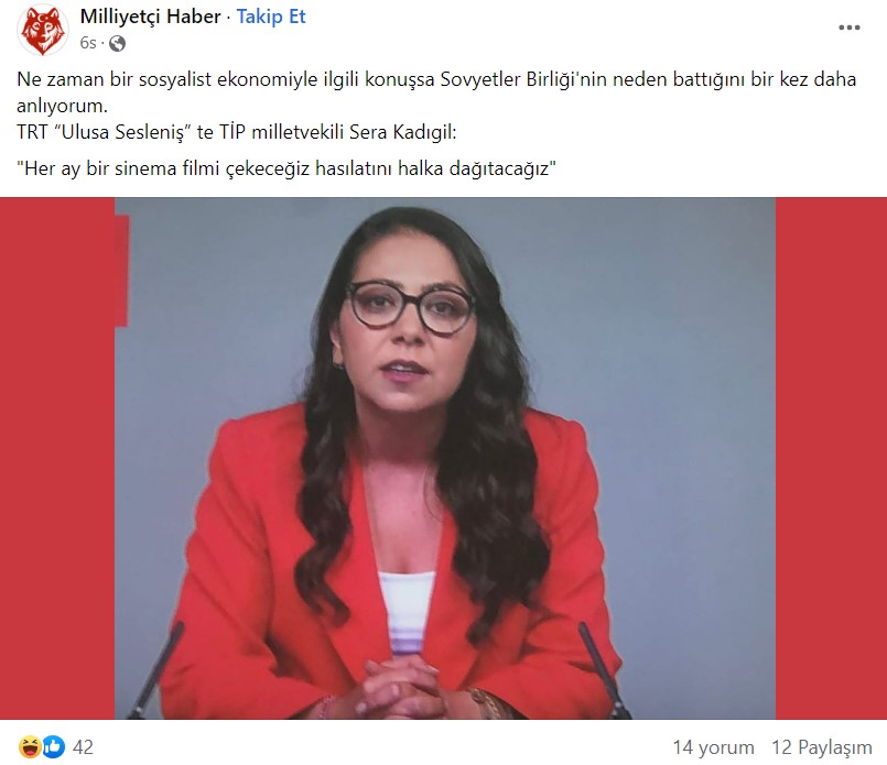 Sosyal medya hesabından yapılan bir paylaşımda TİP sözcüsü ve İstanbul Milletvekili Sera Kadıgil’in TRT propaganda konuşmasında, “Her ay bir sinema filmi çekeceğiz hasılatını halka dağıtacağız” dediği öne sürüldü.
