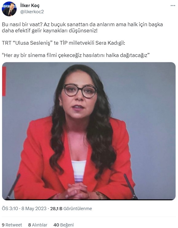 Ancak TİP sözcüsü Sera Kadıgil’in propaganda konuşmasında “Her ay bir sinema filmi çekeceğiz hasılatını halka dağıtacağız” gibi bir ifade yer almıyor.