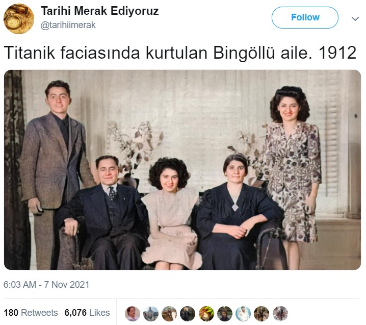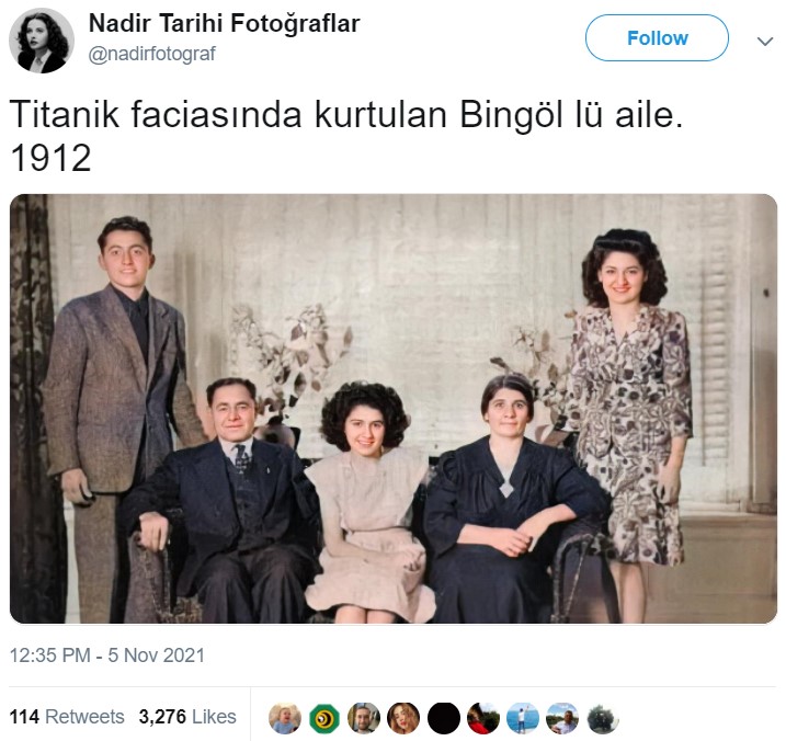 Birçok edebi esere ve sinema filmine uyarlanan RMS Titanic gemisi kazası, 100 yıldan fazla bir süre geçmesine rağmen adından hala söz ettiriyor. Sosyal medyada sıklıkla paylaşılan bir görsel bir süredir internet kullanıcıların gündeminde. Görselde Titanik kazasından kurtulan Bingöllü bir ailenin bulunduğu iddia ediliyor. Böyle bir durumun varlığı yıllardır bilinmiyorken, kullanıcıların aynı görseli, aynı açıklama ile paylaşması dikkatimizi çekti ve bunu inceledik.