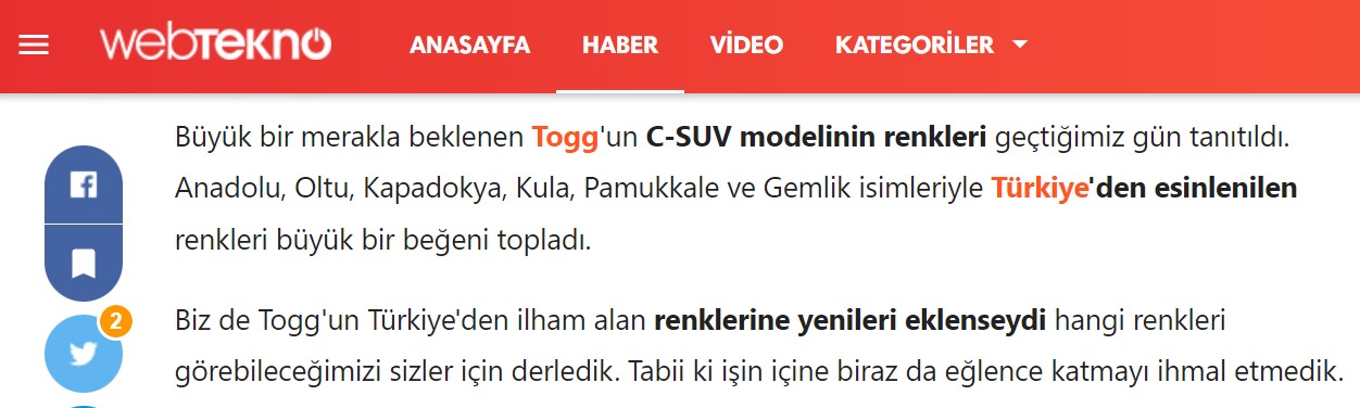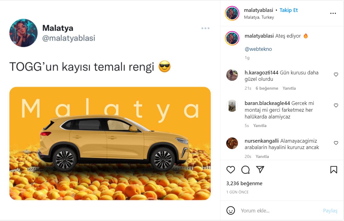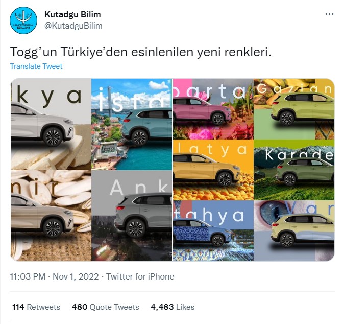 Paylaşımda yer alan görseller teknoloji haber portalı olan Webtekno’dan alınmış. Webtekno, Togg’un resmi olarak açıklanan renklerini haberleştirirken seriye eğlence amaçlı yeni renkler de eklemiş.