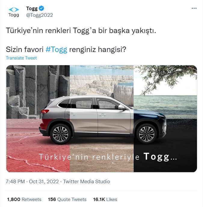 - Twitter paylaşımındaki görseller, webtekno.com’dan alınmış. Webtekno, Togg marka otomobil görsellerini farklı renklerle yeniden tasarlamış.