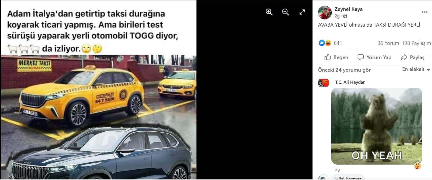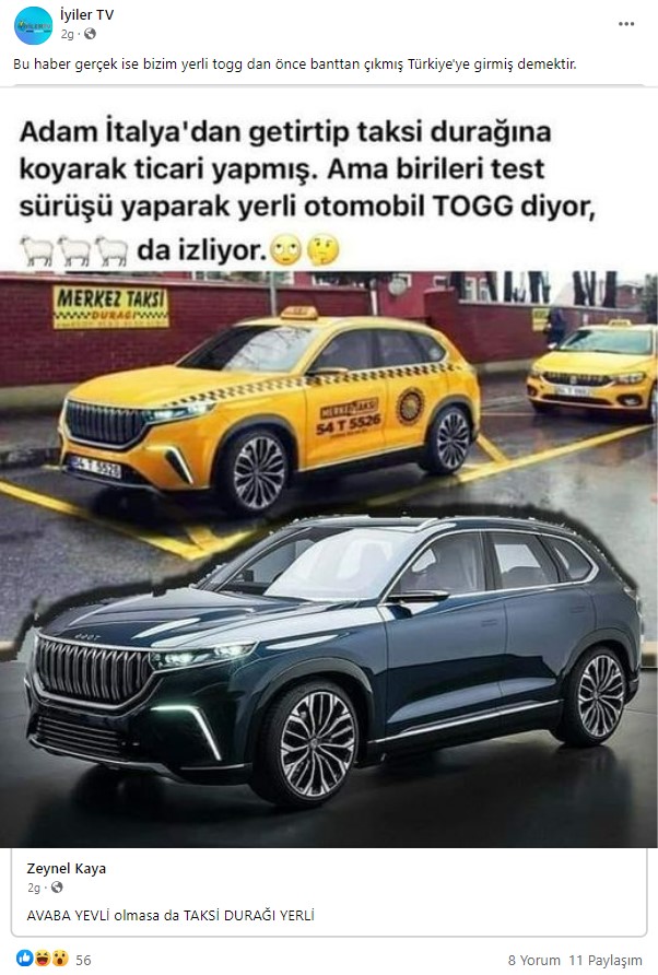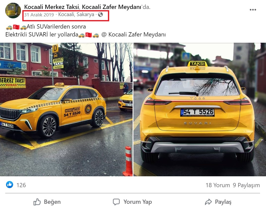 - Togg marka taksi fotoğrafının ilk paylaşımı paylaşımı 31 Aralık 2019’da, Sakarya’daki Kocaali Merkez Taksi’nin Facebook hesabı üzerinden yapılmış.