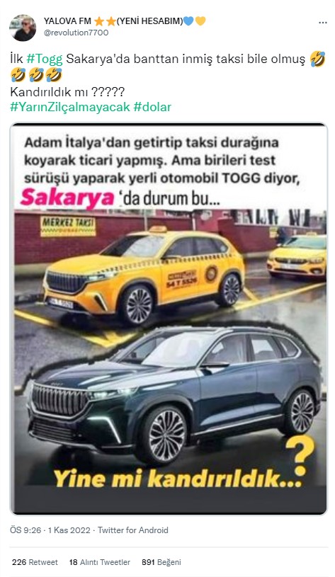 İddiada kullanılan fotoğraf, ilk kez bu hesap tarafından 31 Aralık 2019 tarihinde paylaşılmış. Bu tarihte henüz Togg’u üretecek fabrikanın dahi kurulmamıştı. Bugün dahi satışa sunulmamışken 2019 yılında taksi olarak kullanılması gerçek hayatın akışına uymuyor.