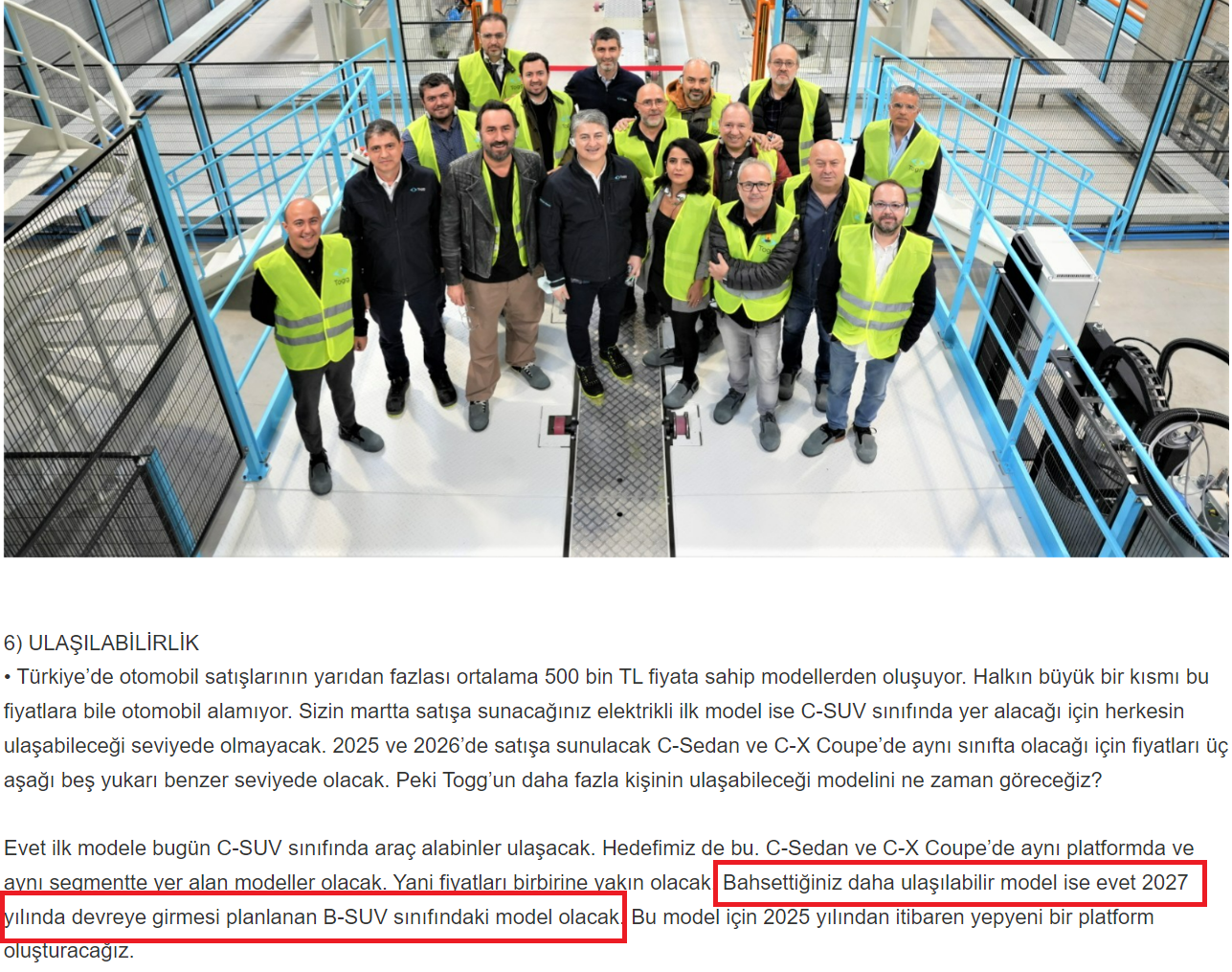 “Evet ilk modele bugün C-SUV sınıfında araç alabinler ulaşacak. Hedefimiz de bu. C-Sedan ve C-X Coupe’de aynı platformda ve aynı segmentte yer alan modeller olacak. Yani fiyatları birbirine yakın olacak. Bahsettiğiniz daha ulaşılabilir model ise evet 2027 yılında devreye girmesi planlanan B-SUV sınıfındaki model olacak. Bu model için 2025 yılından itibaren yepyeni bir platform oluşturacağız.”