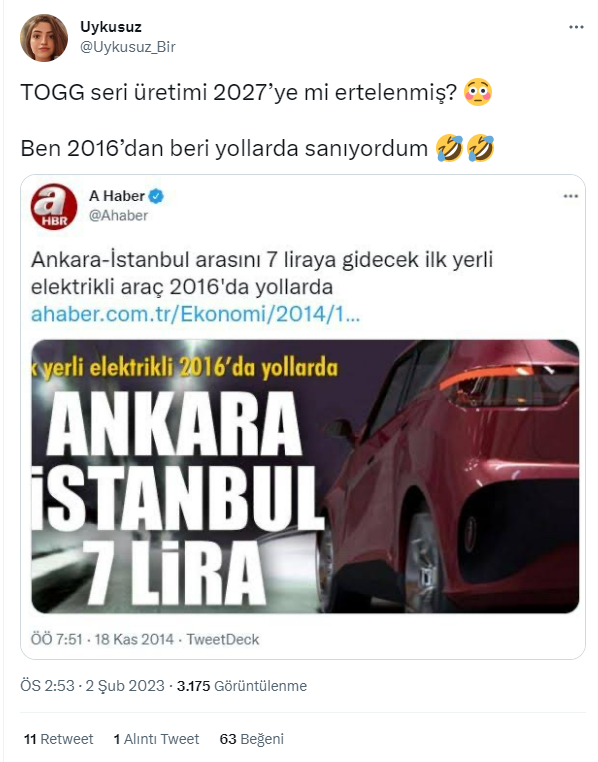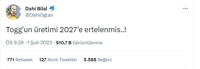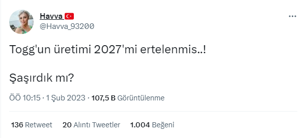 - Togg araçlarının üretimi 2027’ye ertelenmedi.