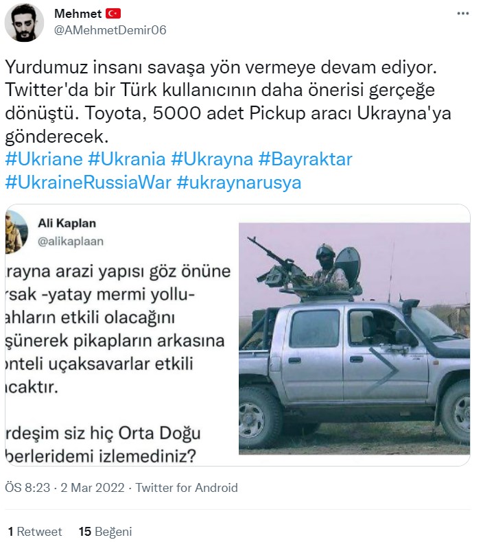 Geçtiğimiz günlerde sosyal medya kullanıcıları arasında, Toyota’nın Ukrayna’daki askeri operasyonlarda destek amacıyla 5 bin araç göndereceği konuşuldu.