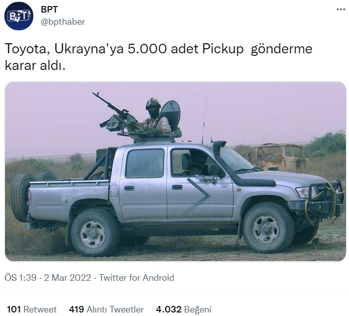 - Toyota Hilux pick-up aracının Ukrayna’ya destek amacıyla gönderildiğine dair bir kanıt bulunmuyor.