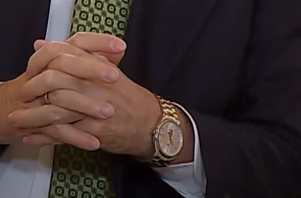 Uydudan yayınlanan yani televizyonda gördüğümüz yayında kj bandı bulunurken; dijitalde paylaşılan yayında bulunmuyor. Dolayısıyla kj bandı, Erdoğan’ın kol saatini görmemizi engellemiyor. Böylece saatin nispeten net göründüğü anlarda uydudaki diğer yayından saatinin o sırada kaç olduğunu tespit ettik. Çünkü saat gibi pek çok detay kj bandında yer alıyor. Öncelikle, yayın boyunca akrep ve yelkovanın hareketli olduğunu yani saatin çalıştığını belirtelim. Saatin durmuş olması gibi bir durum söz konusu değil. O halde örnek olarak yayından bir kareye göz atalım;