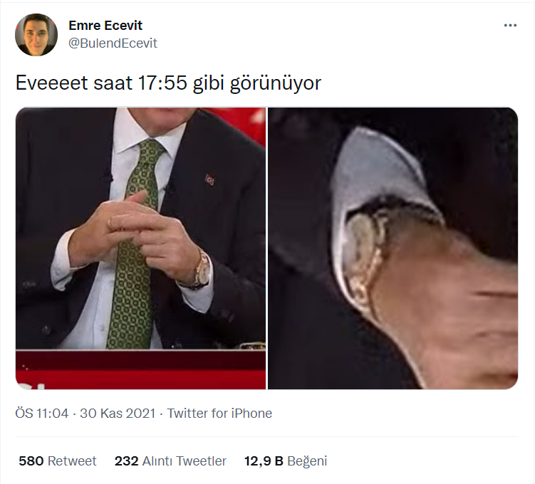 Saat bize göre ters göründüğünü göz önüne alırsak, Erdoğan kendi açısından saatine baktığında saati 22.30 iken bizde elbette farklı görünüyor. Aşağıdaki görsellerden bunu daha net anlayabilmek mümkün.
