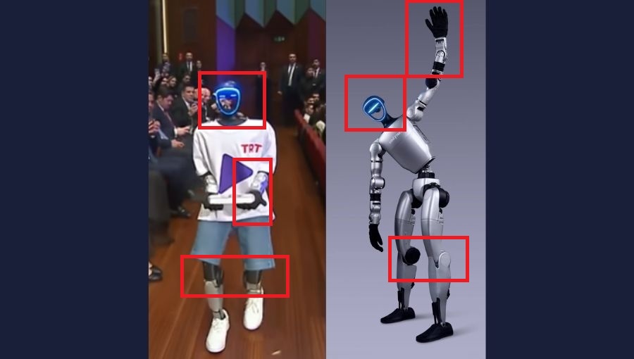 Görüldüğü gibi ilk bakışta bir benzerlik var. Robotun yüzünün yanı sıra eklem ve el kısmının detayları da benziyor. Unitree G1’in Türkiye’de de satışı olan bir robot.