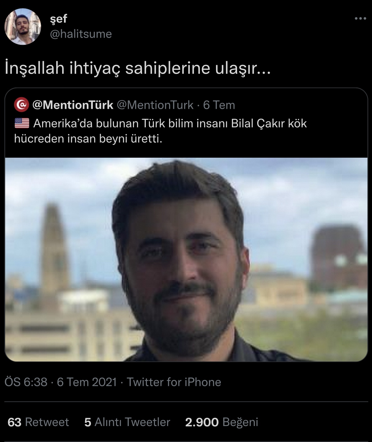 Twiter’da 06.07.2021 tarihinde @MentionTurk adlı sayfanın paylaşımında Amerika’da bulunan Türk bilim insanı Bilal Çakır’ın kök hücreden insan beyni ürettiği iddia edildi. Gündemde yankı uyandırarak birçok haber mecrası tarafından paylaşılan iddia sosyal medyada da yüksek oranda etkileşim alan haberden biri oldu. Sosyal medya kullanıcıları arasında Türki bilim insanını takdir edenler olduğu gibi haberin gerçekliğini şüpheyle sorgulayan çok sayıda kullanıcı da var. Beynin en komplike insan organlarından biri olması ve üretilmesi konusunda dünya genelinde bir aşama kaydedilmemiş olması bu şüpheleri güçlendiriyor. Akıllarda tek soru; Türk bilim insanı Bilal Çakır insan beyni üretmeyi başarmış olabilir mi?