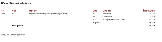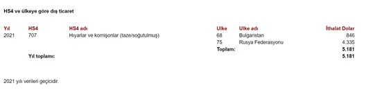 Trendeconomy’nin 2019 verilerine göre, Türkiye dünya salatalık ihracatında %1.43’lük pazar payına sahip. Bu oran ithalat pazarında %0.003. TÜİK’in hıyar ve kornişon ithalatı verilerine bakıldığında 2021 yılında Bulgaristan ve Rusya’da, 2020 yılında ise Almanya, Gürcistan ve KKTC’den hıyar ve kornişon ithal edildiği