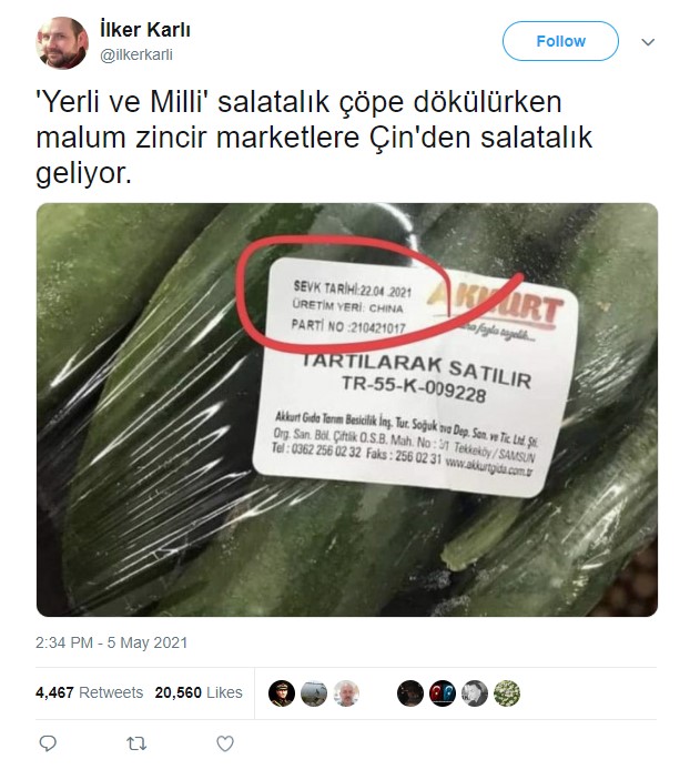 Twitter’da ve bir kaç haber sitesinde yer alan iddiaya göre Türkiye’de yerli salatalık çöpe dökülürken zincir marketler Çin’den salatalık ithal etmektedir. İddiaya konu olan tweet 20 binin üstünde beğeni ve 4 binin üstünde retweet almıştır. Aynı zamanda, Twitter’da iddia pek çok kişi tarafından dile getirilmiştir. İddia hakkında Ekşi Sözlük’te de başlık açılmıştır. İddiaya sebep olan fotoğraf ise aşağıdaki fotoğraftır. Fotoğraftaki salatanın etiketinde salatalığın üretim yerinin Çin olduğu ifadesi yer almaktadır.