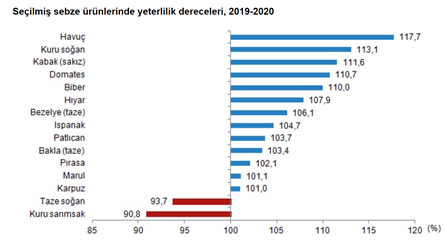 TÜİK’in açıklamış olduğu 2019-2020 verilerine baktığımızda Türkiye’nin salatalık üretiminin, tüketimi karşılama oranı %107.9’dur. Bu oran üretimin yurt içi talebi ne oranda karşıladığını göstermektedir. Buna göre Türkiye salatalık üretimi fazlası vermektedir. Ayrıca, görüldüğü üzere kuru sarımsakta da bu derece %90,8 oranındadır. Yani talep edilen kuru sarımsağın en az %9,2’sini ithal edilmektedir.(4. Görsel)