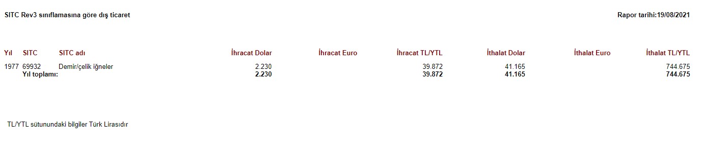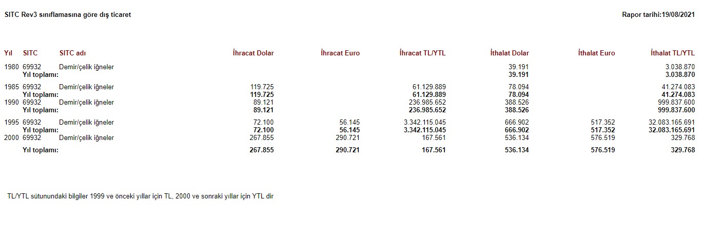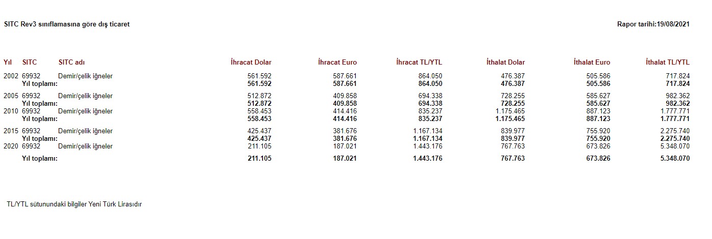 Bu veriler, Türkiye’de iğne ve benzeri tel mamuller alanında uzun yıllardır üretim ve dış ticaret geçmişi bulunduğunu göstermektedir.