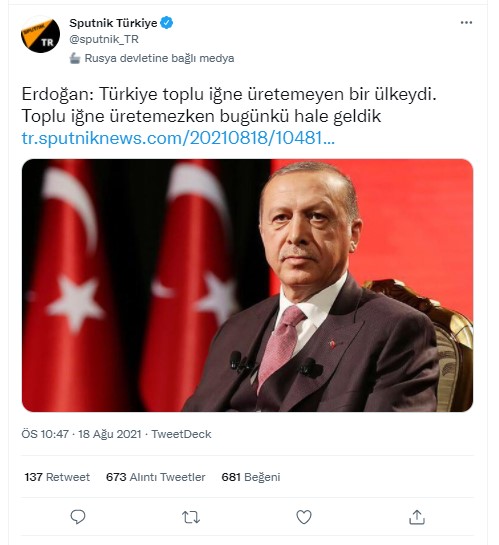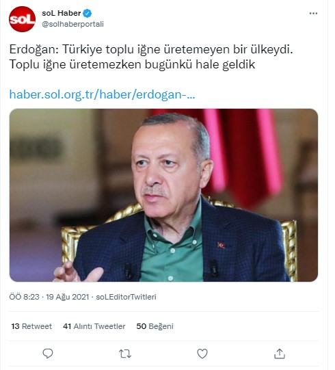 Cumhurbaşkanı, 18 Ağustos 2021 tarihli Kanal 7, Ülke TV, 24 TV, TVNET ve TV 360 ortak canlı yayınında da “Türkiye toplu iğne üretemeyen bir ülkeydi. Toplu iğne üretemezken bugünkü hale geldik” ifadesini kullanmıştı. Erdoğan’ın bu ifadesi sosyal medyada gündem oldu.